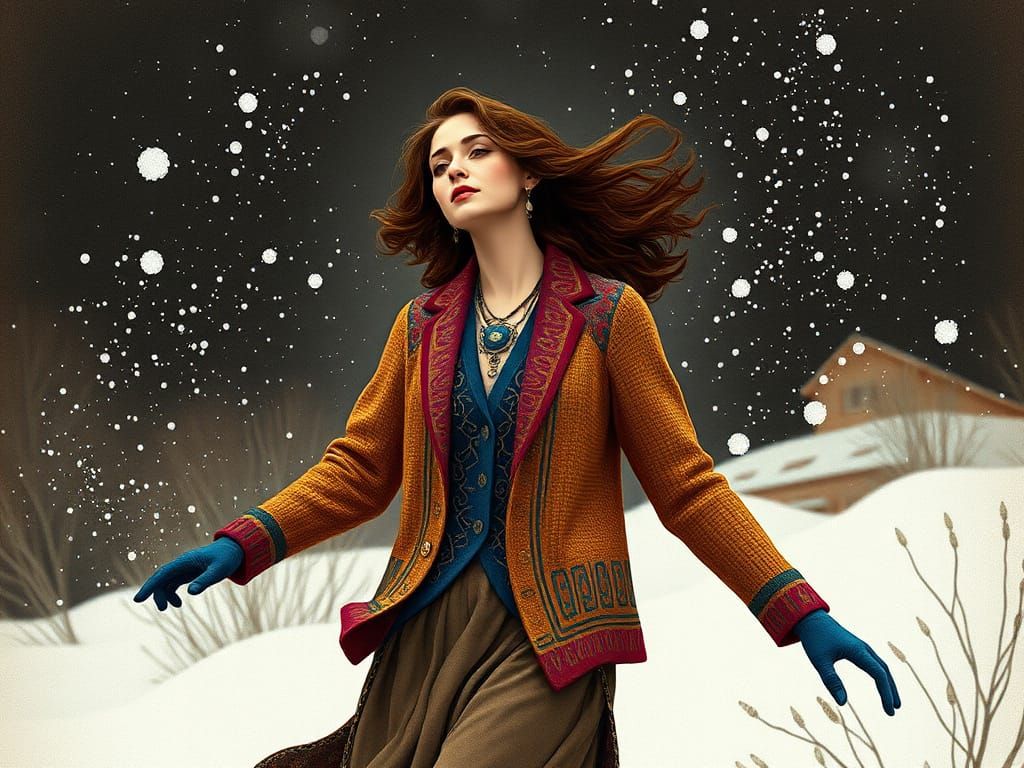 A high-resolution fashion illustration of a woman in a colored cardigan frolicking in the snow. The image features deep brown tones with Egyptian blue accents and masonic motifs, inspired by 1930s design.