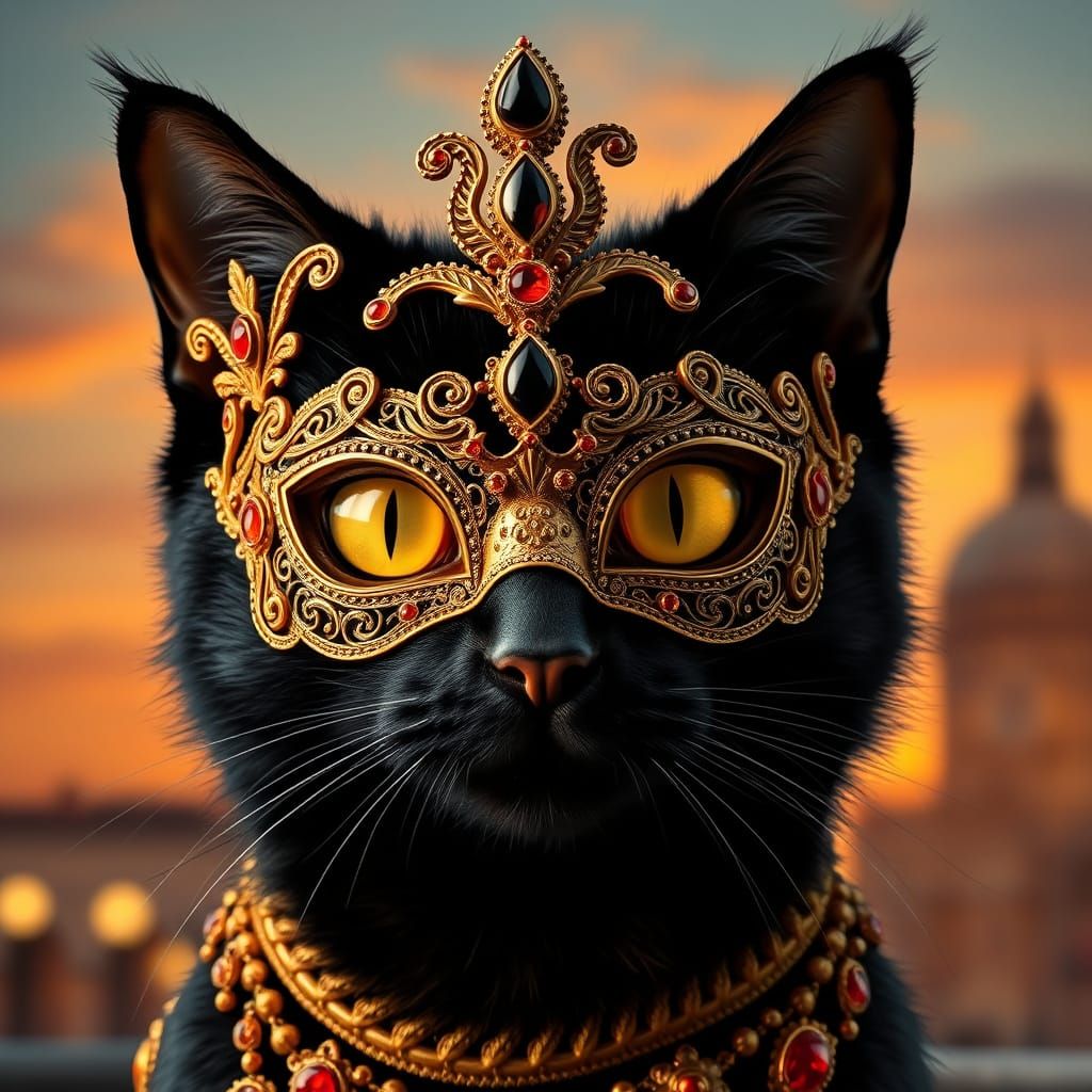 A striking picture of a black cat wearing a golden Venetian mask decorated with red gemstones. The cat's golden-yellow eyes stare intently at the viewer, set against a blurred sunset backdrop. The image is photorealistic.