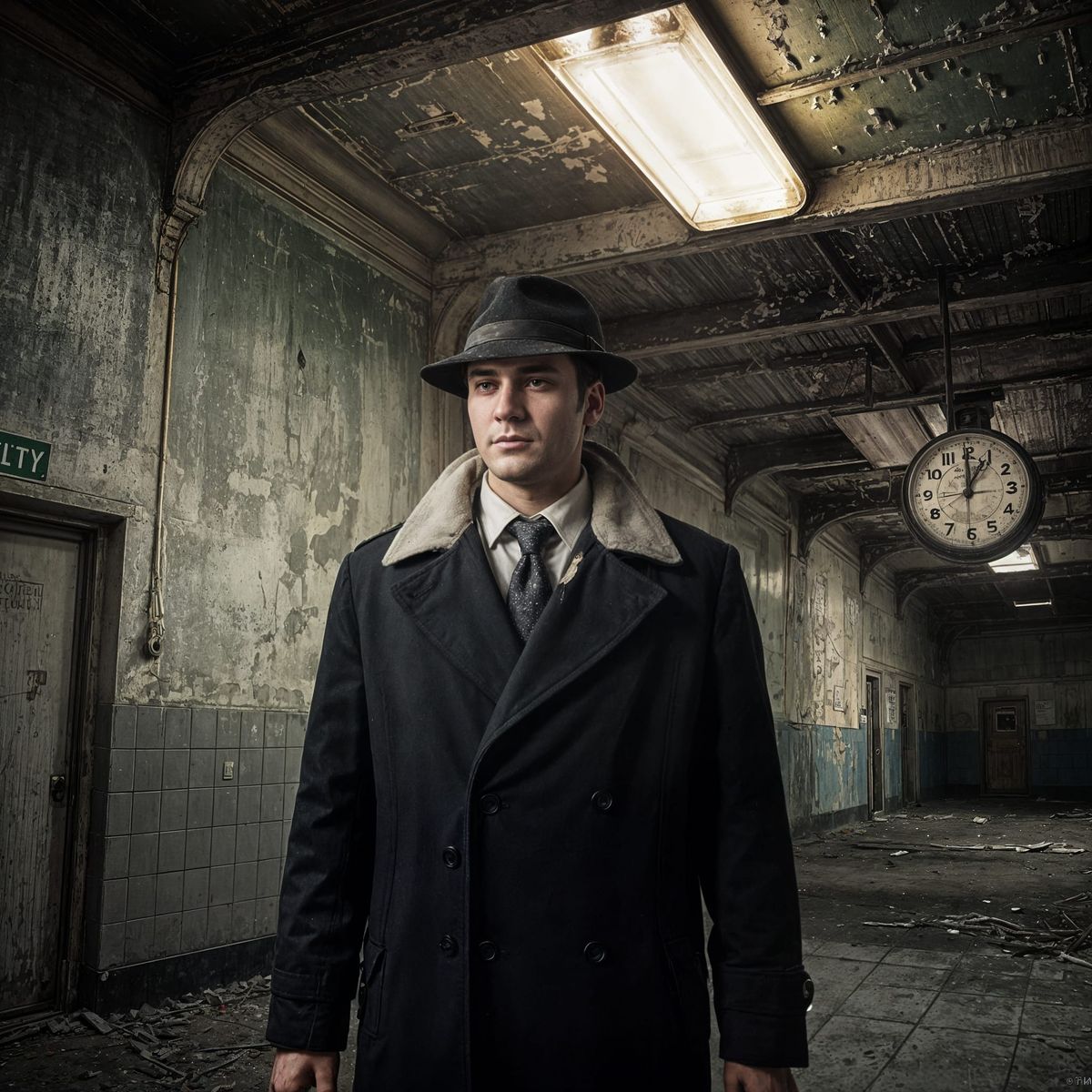 This image depicts the eerie interior of an abandoned metro station featuring a dilapidated subway train. The scene evokes a film noir aesthetic, with a liminal, ominous atmosphere.