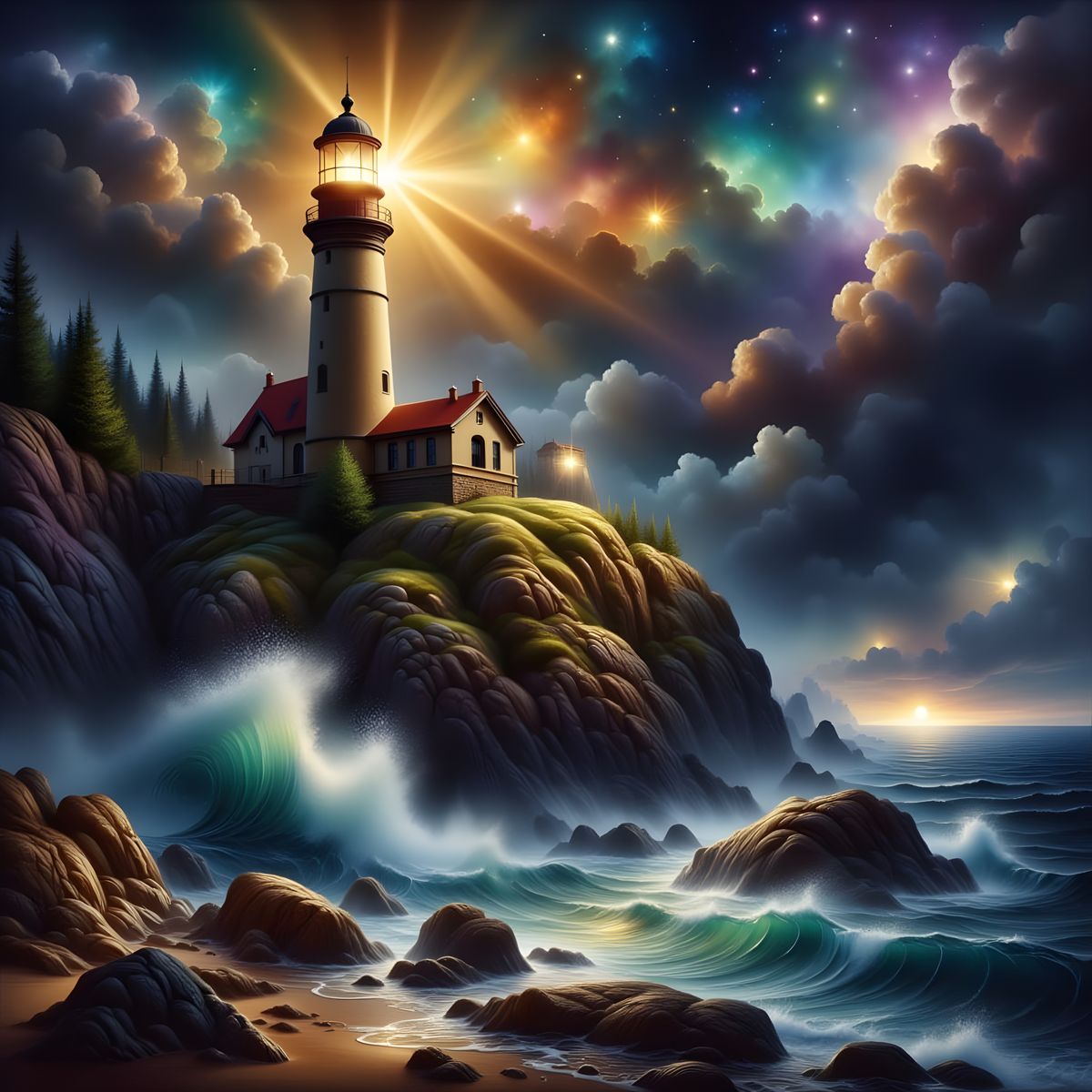 This image depicts a majestic, ancient lighthouse on a rocky cliff during a stormy night. Its powerful beam illuminates the turbulent sea and crashing waves in a dramatic oil painting style with thick brush strokes.