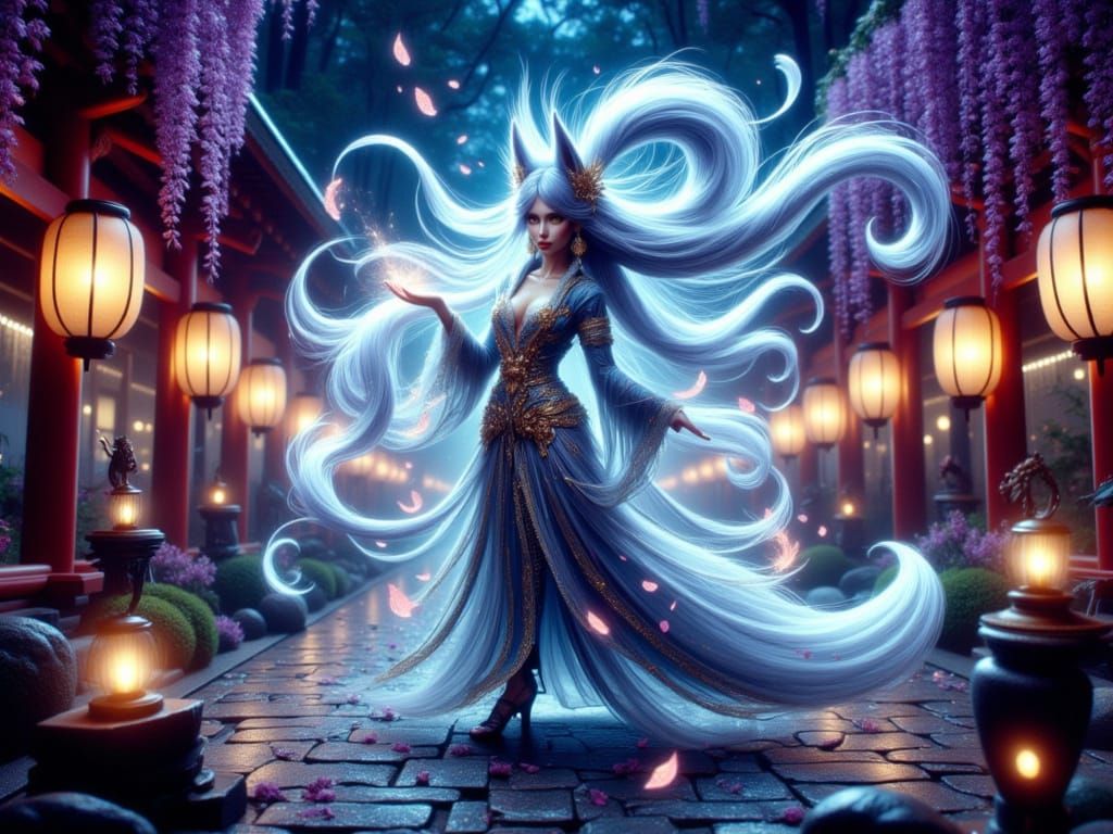 This enchanting image shows a mystical nine-tailed Kitsune performing an ancient ritual dance in a serene Japanese shrine garden setting, surrounded by spectral fire, shimmering lights, and ethereal beauty.