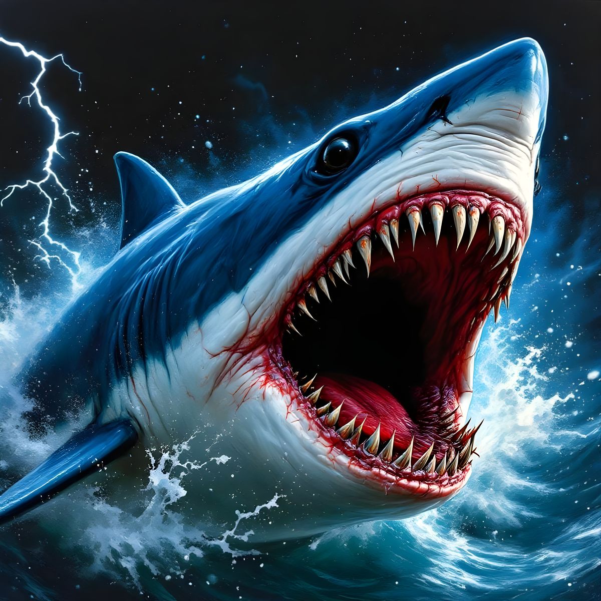 A photorealistic image of a great white shark leaping from the water. Its open mouth reveals rows of sharp teeth, while the water explodes around it in bursts of colorful energy.