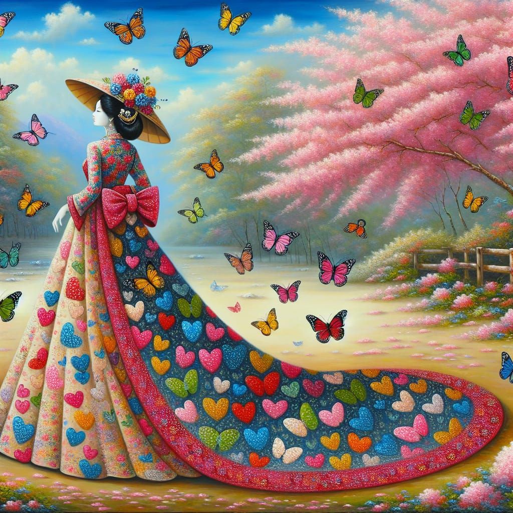 An oil painting shows an elegant South Asian woman in a modest, colorful gown featuring heart and cat patterns. She wears a cat-shaped hat amidst pink cherry blossoms and butterflies.