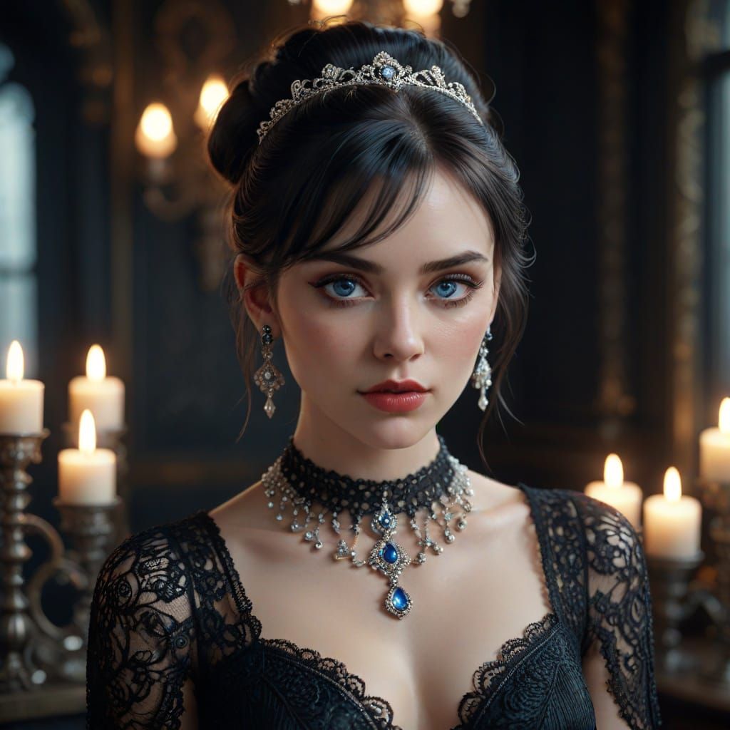 This image shows a striking woman with pale skin and dark hair, adorned with silver jewelry and a black lace dress. The scene features dramatic lighting and a moody, elegant atmosphere.