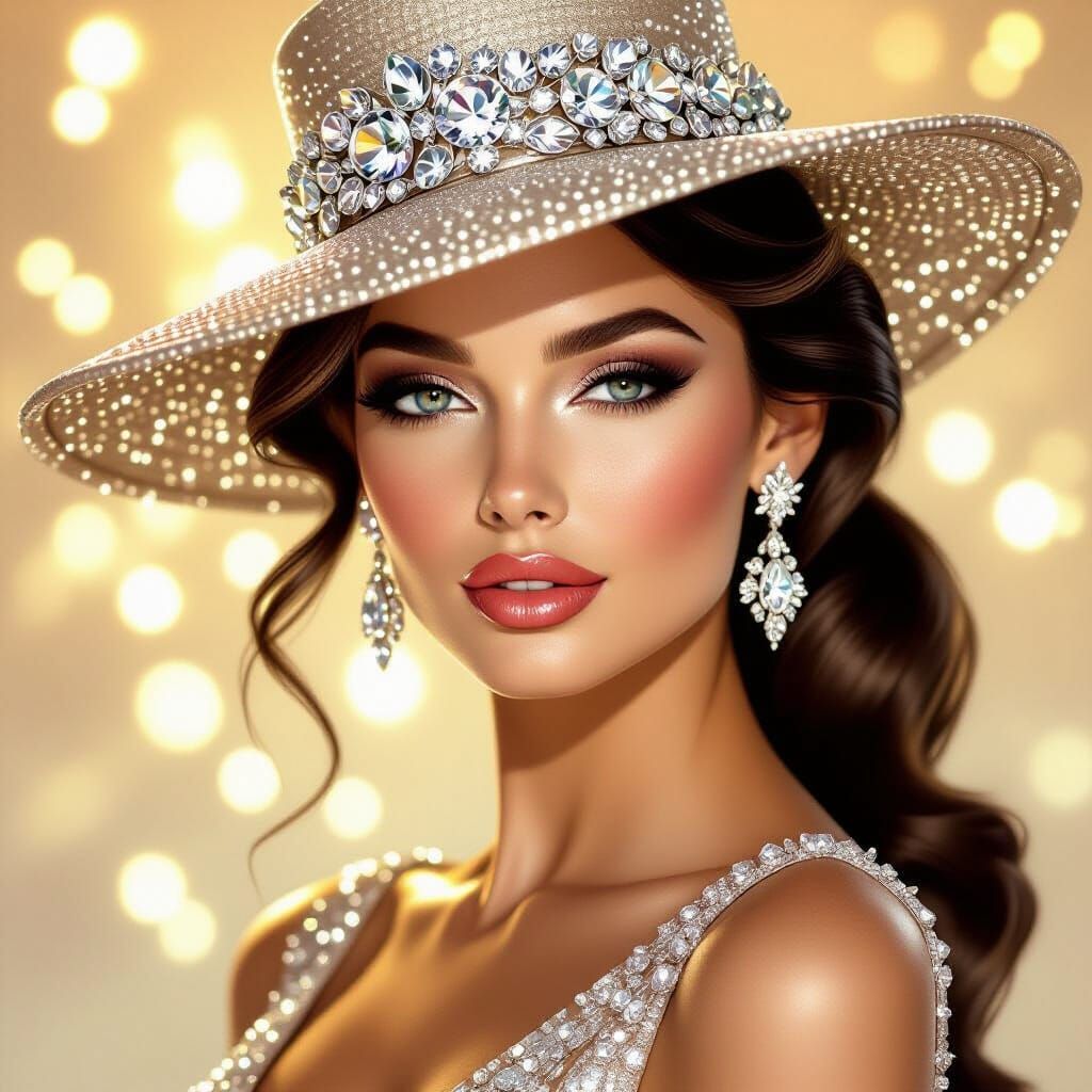 This image features a glamorous woman wearing a dazzling diamond-adorned hat and a shimmering glitter dress. The opulent style highlights the sparkle of the diamonds with dramatic golden hour lighting.