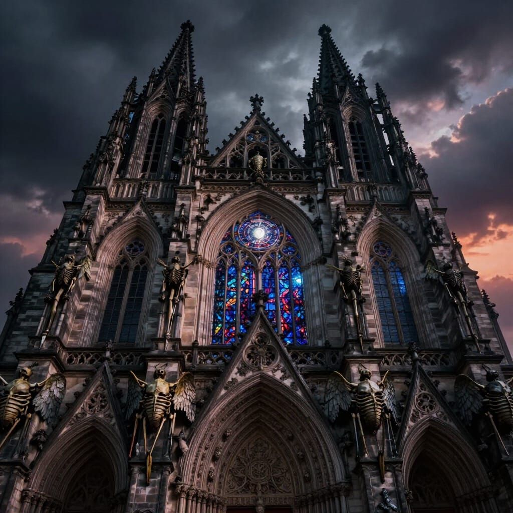 This image features a majestic gothic cathedral with spires against a stormy twilight sky. It showcases intricate carvings and arcane symbols, rendered with dramatic lighting and a deep color palette.
