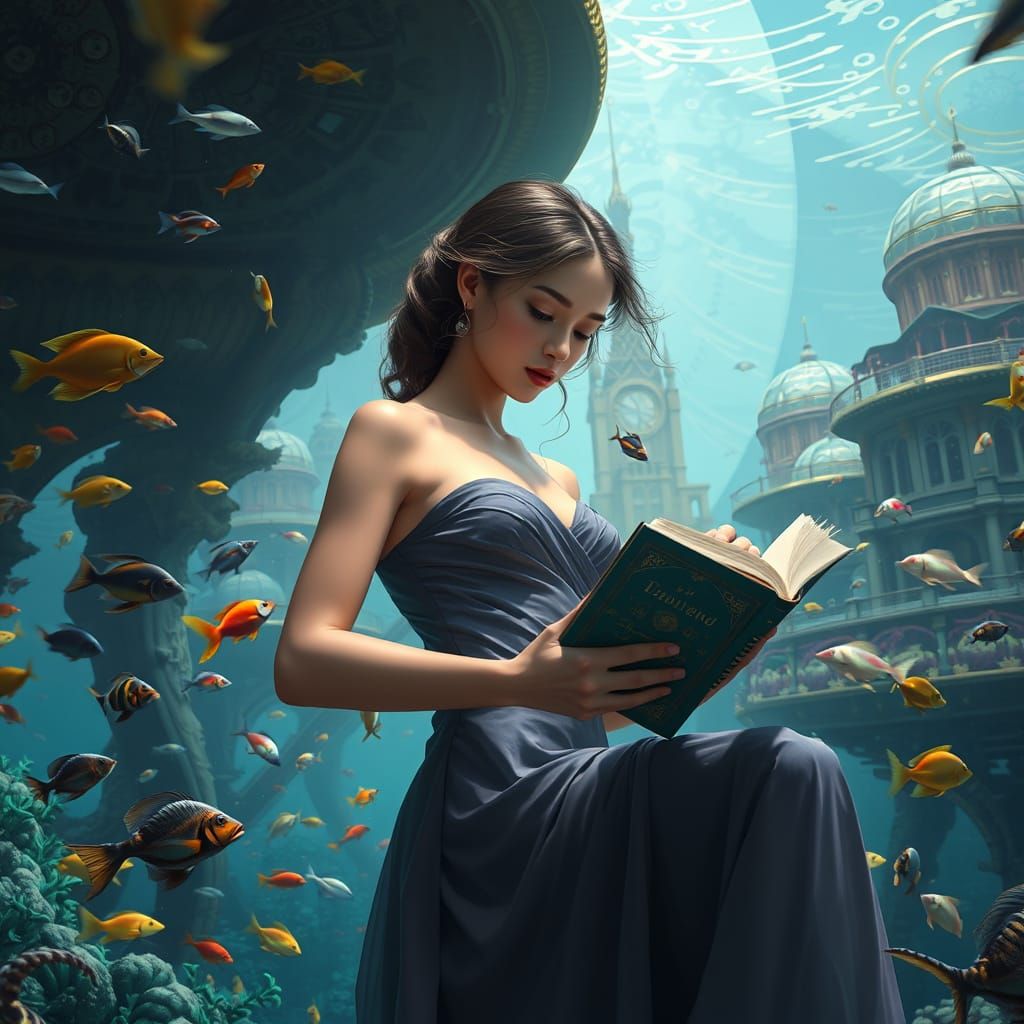 A digital painting of a woman reading in an underwater city. Transparent domes reveal intricate architecture and aquatic life, all rendered with deep colors in a matte fantasy style.