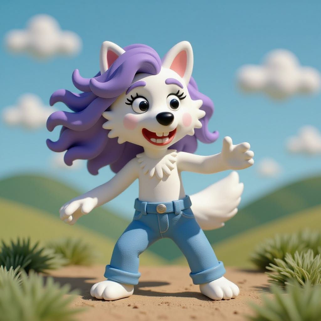 This image features a claymation white wolf with electric purple hair and blue jeans in a whimsical, handcrafted stop-motion style. Set against a dreamy landscape, it has soft, detailed features and a lowbrow aesthetic.