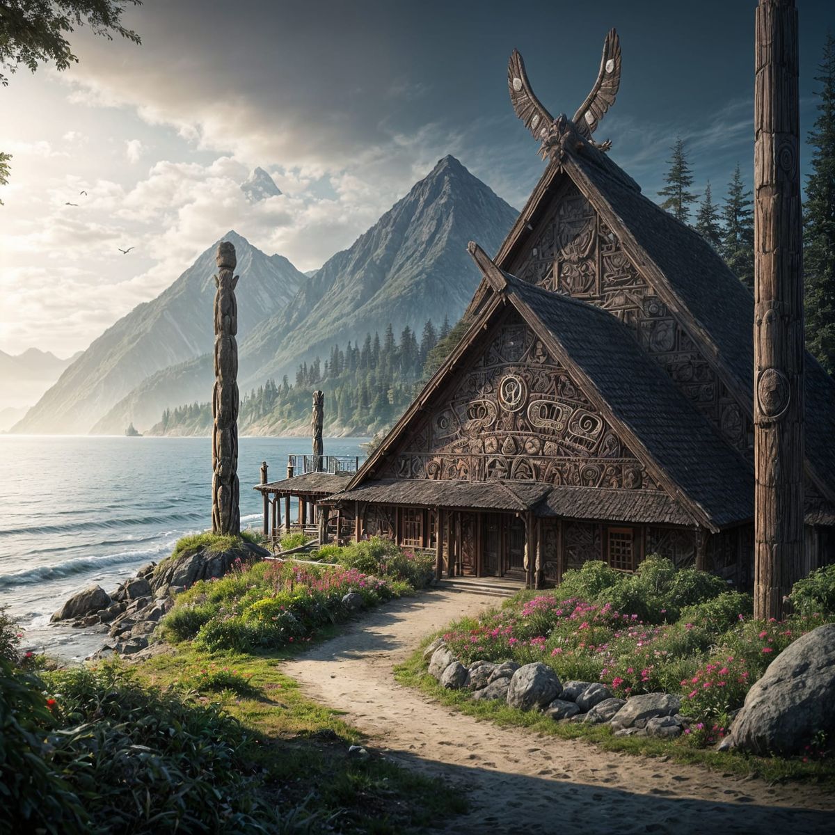 Haida Indian longhouse with many large and medium totem poles that have eagles, salmon, bears and wolves carved into them using the Haida style. is looking from the far end of the garden at the house. Carvings are mostly painted red and black. Large glacier capped mountains in the background and the ...