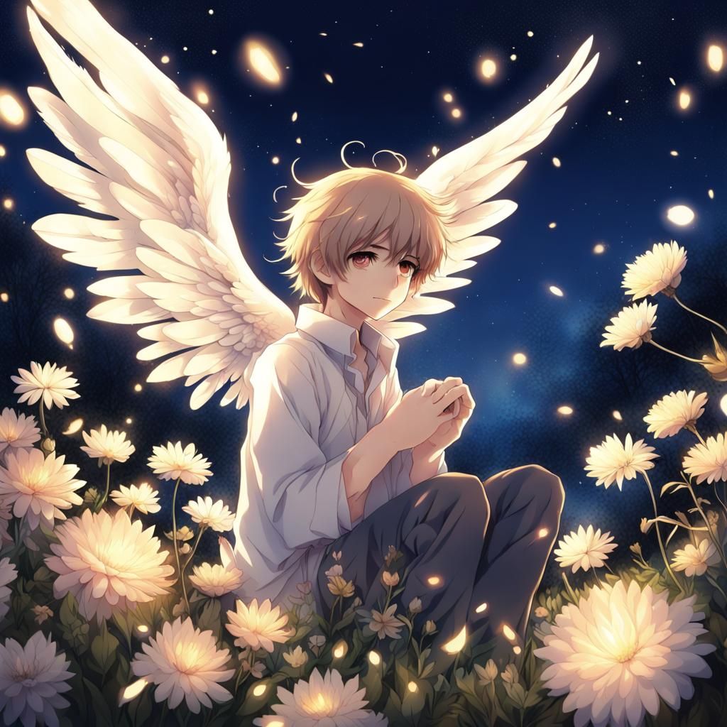 This image shows a boy angel surrounded by flowers at night. Fireflies add to the magic of the scene, rendered in a vibrant anime art style.