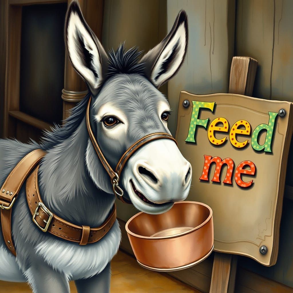 This image shows a fluffy donkey in a rustic scene, wearing a harness and holding an empty bowl. The artwork is reminiscent of classic whimsical illustrations.