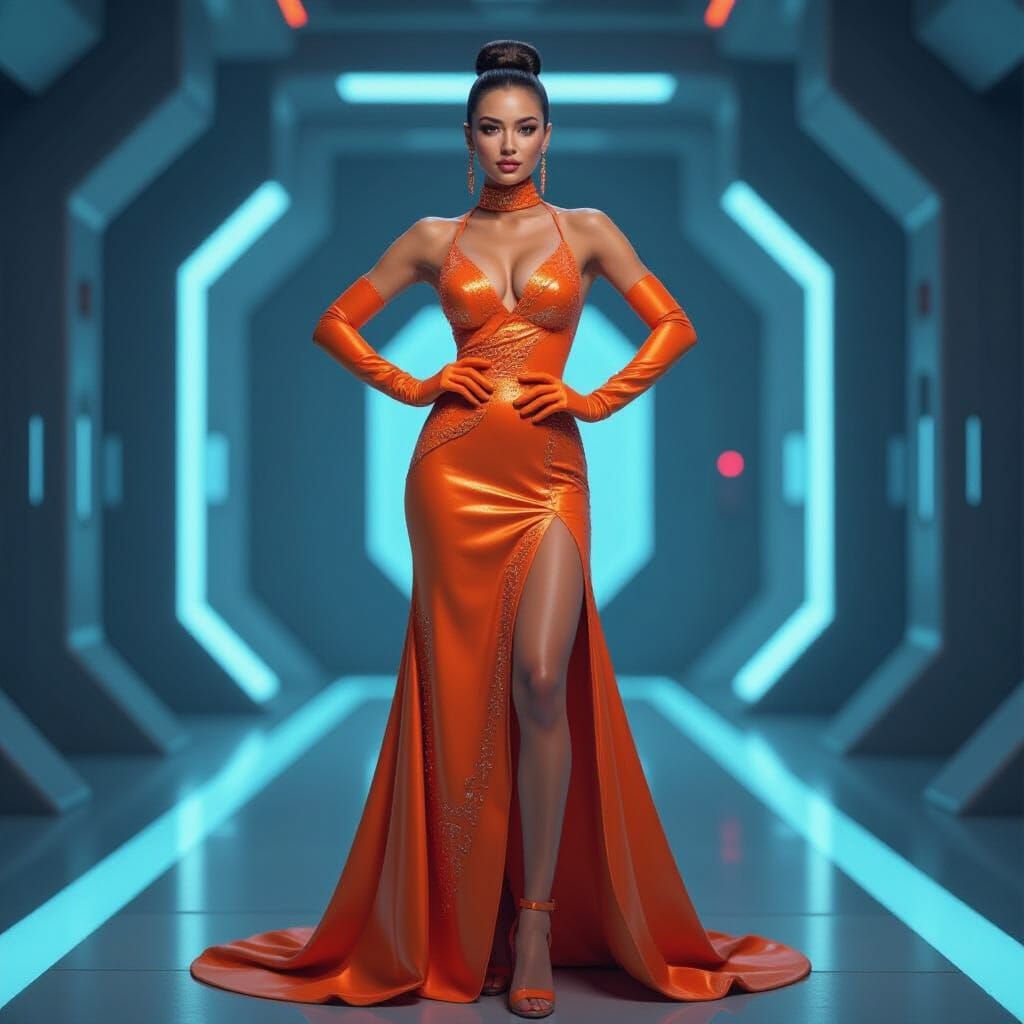 This image shows a futuristic AI posing in a modern setting. The AI wears an orange sequin dress and satin gloves in a cyberpunk aesthetic. The style blends neon futurism with stylized character design.
