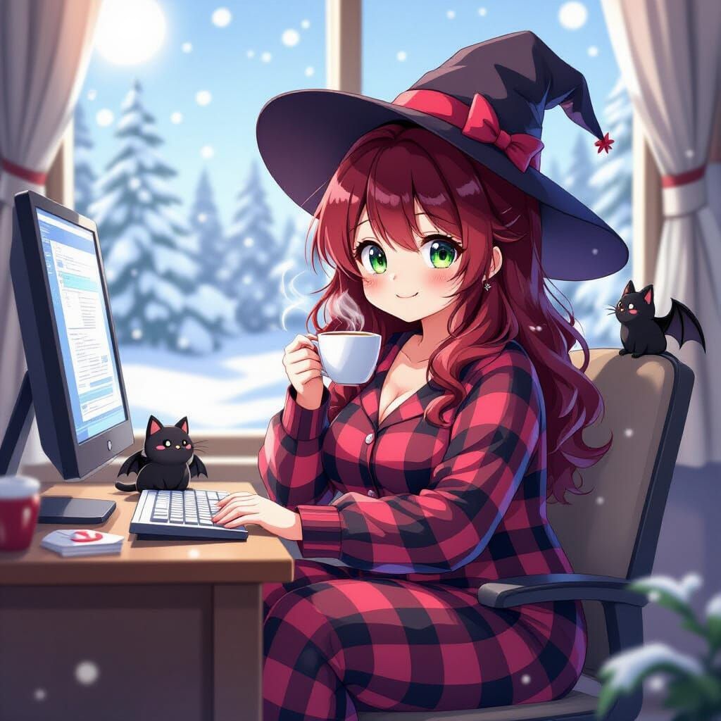 This detailed anime drawing features a cute, chubby woman with crimson hair and green eyes in plaid pajamas and a witch's hat, drinking tea while working at her computer. A bat sits nearby, with a snowy, sunny morning visible outside.