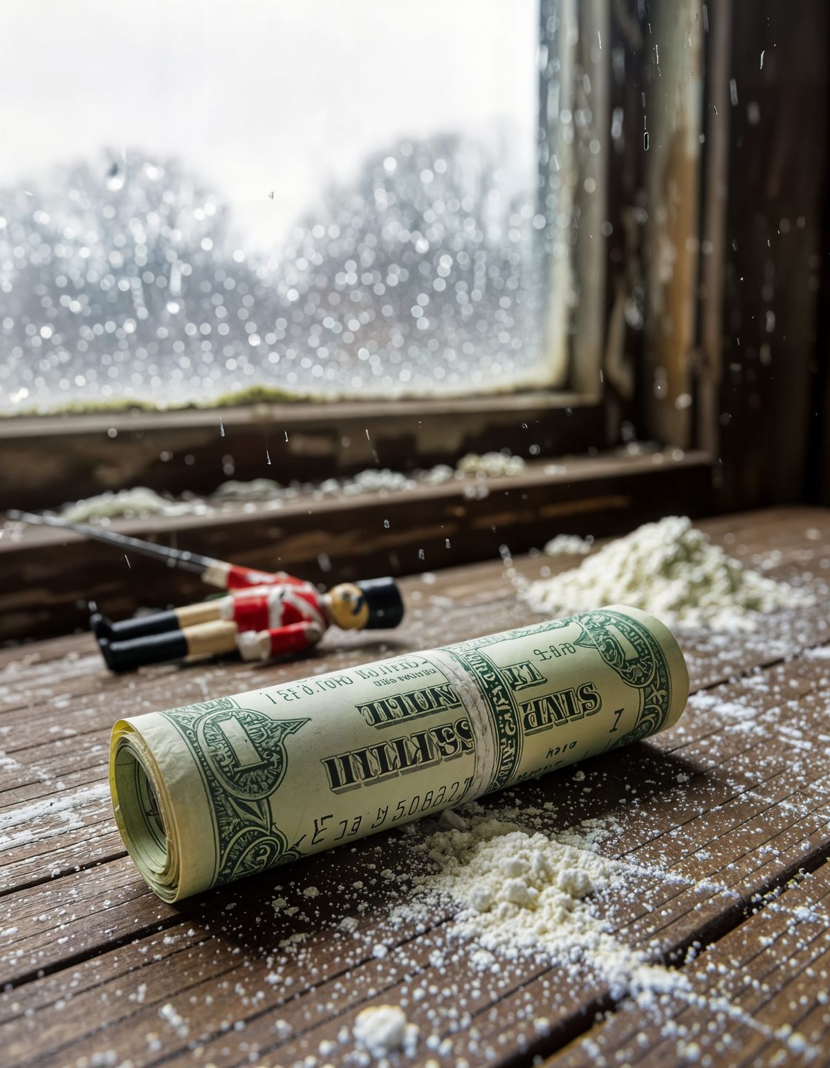 This image shows a dollar bill and white powder on a worn wooden table. A fallen toy soldier lies in the background, with a rainy window adding to the melancholic, muted atmosphere.
