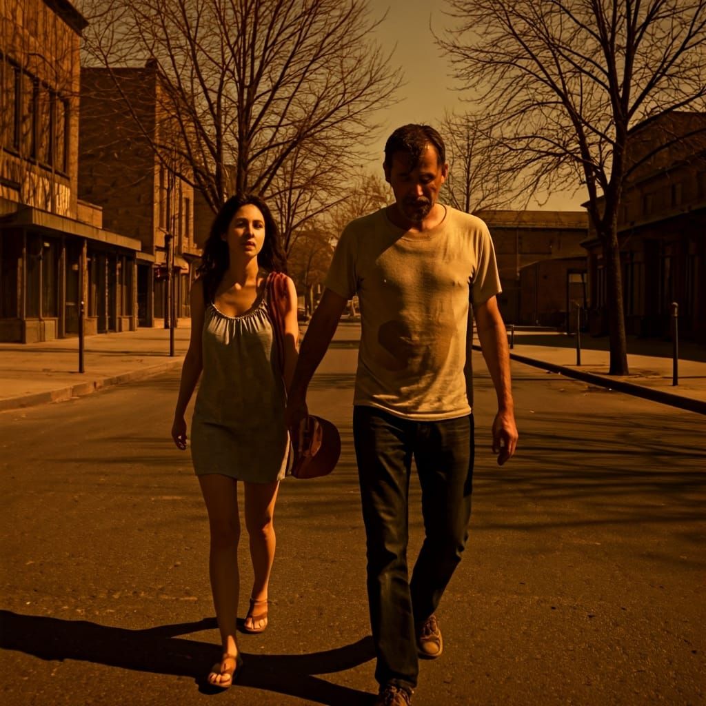 This image depicts a man and woman walking on a sweltering city street with hot asphalt and no trees, conveying a cinematic and atmospheric summer scene. The image has a film-like quality.