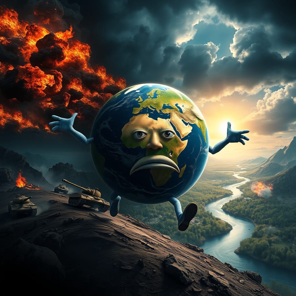 This image shows a hyperrealistic Earth personified with human features, fleeing destruction towards a serene landscape. The dramatic scene, rendered with cinematic lighting, contrasts environmental disasters with natural beauty.