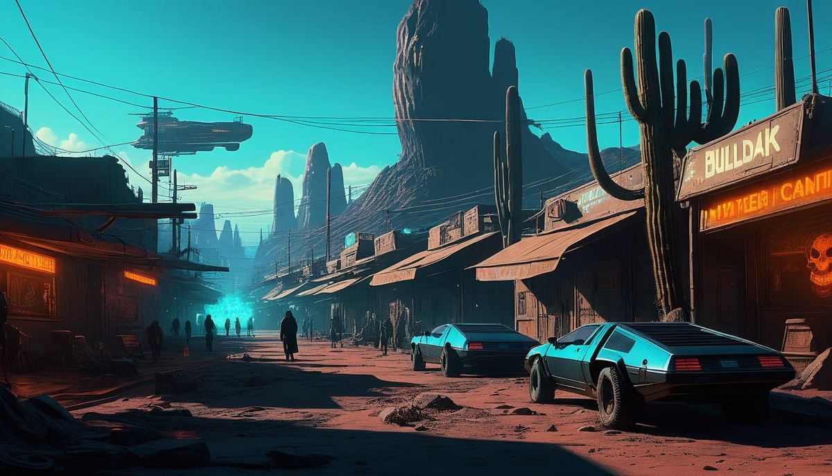 This image shows a cyberpunk village at dusk with adobe huts and neon banners. Cyborg mariachis play under holographic skulls, with retro-futuristic tech and Day of the Dead motifs in a cyberpunk aesthetic.