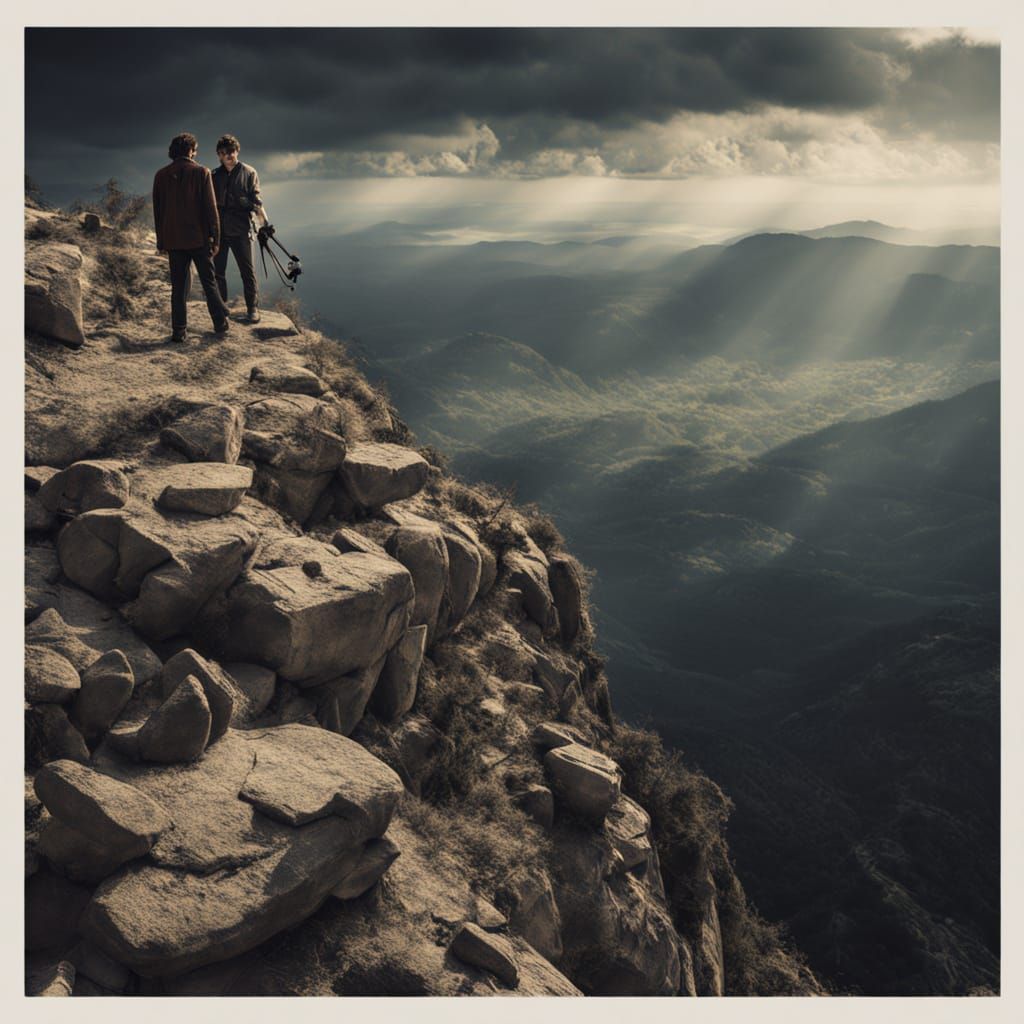 This image shows a sorrowful angel gazing down from a mountaintop. The scene is bathed in cinematic lighting with shadows accentuating the angel's face. A grey sky conveys a sense of sadness.