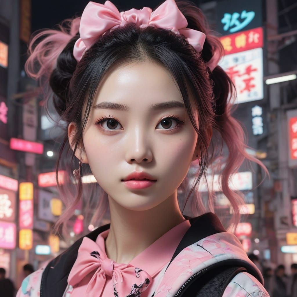 This image is a vibrant digital portrait of an 18-year-old girl in a whimsical, niji-style setting. She wears a pink scrunchie and a vibrant pink and black outfit with mixed patterns, evoking a sense of 1980s Hong Kong-style animation. The artwork features ornate details, pastel colors, and soft lighting...