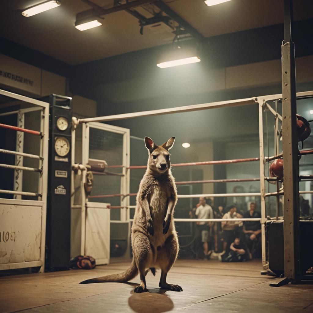 As we observe the scene unfolding before us, we see the fighters cheering and laughing at the sidelines as they gaze upon the curious creature standing near the boxing ring. The dwarf wallaby, with its wide-eyed expression and twitching nose, seems a bit perplexed by the commotion around it."
