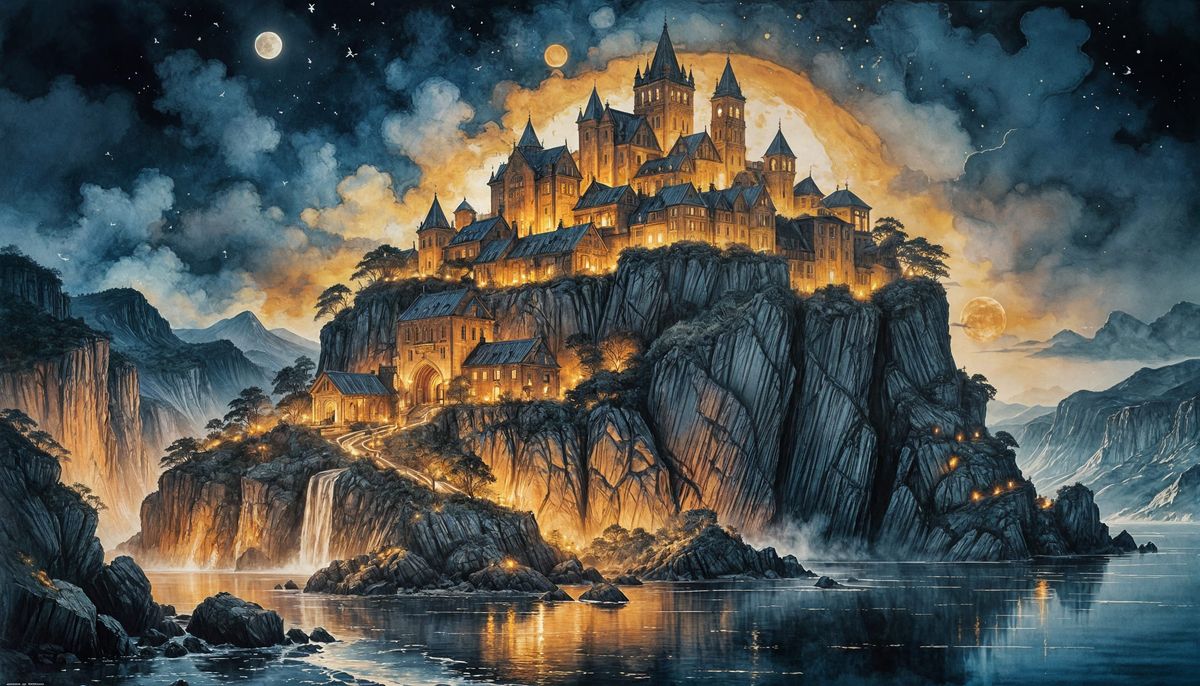 This image shows a butterfly double exposure with a golden moon in the sky above an ancient city. The artwork features dripping ink and splattering techniques on antique paper.