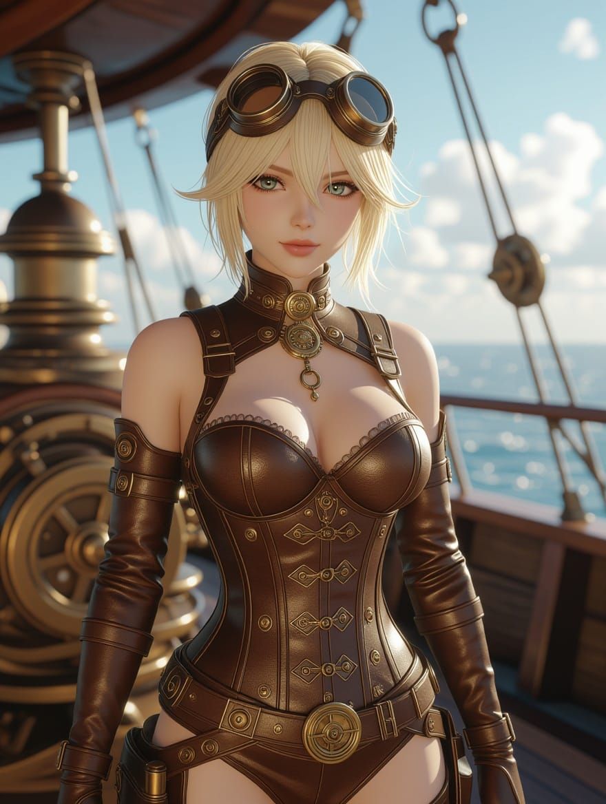 This image shows a stunning steampunk woman standing on an airship deck, surrounded by intricate brass gears and copper pipes, with vintage sci-fi machinery in a highly detailed 3D anime art style, reminiscent of cyberpunk aesthetics and anime illustrations.