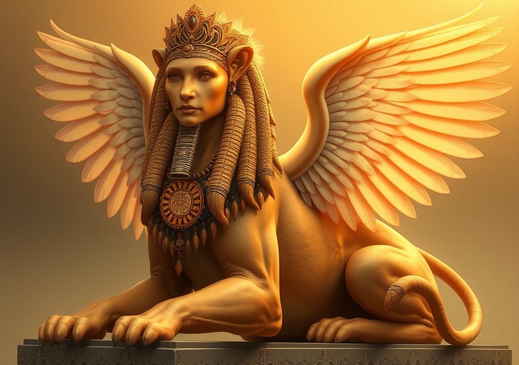 A striking picture of a Greek sphinx with a woman's bust and lion's body, presented in an Art Nouveau style. Golden feathers adorn the sphinx鈥檚 headdress, with wings spread wide.