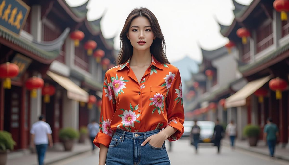 This image shows a beautiful Chinese woman in jeans and a silk shirt, set against bustling streets and traditional architecture. The photorealistic image captures intricate details and textures, in a style evoking classic portraiture.