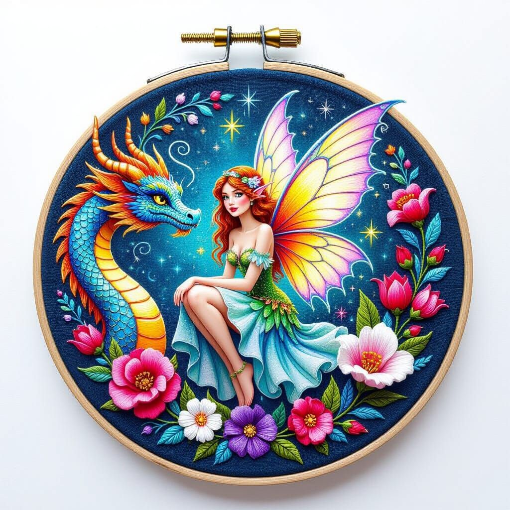 A vibrant fairy is encircled by a luminous dragon and flowers, all within an embroidery hoop. The image evokes traditional embroidery art with colorful threads and intricate details.