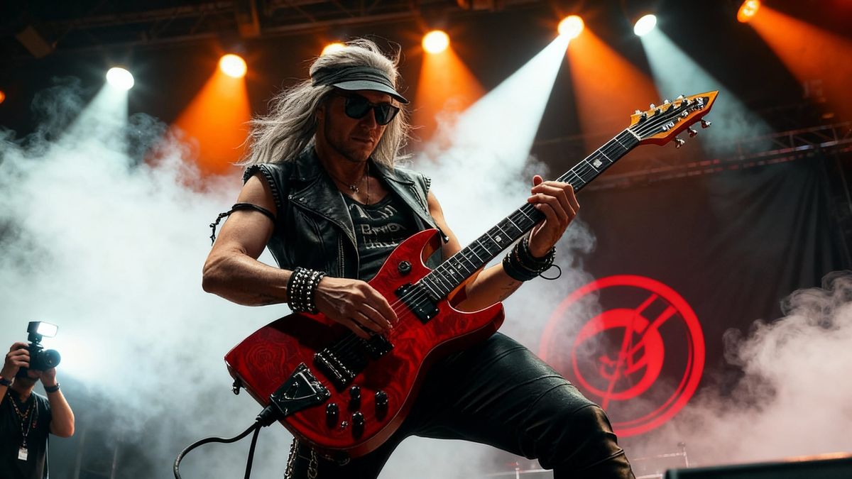 This image captures a dynamic hard-rock musician performing with an electric guitar under dramatic stage lights, fog, and camera flashes.