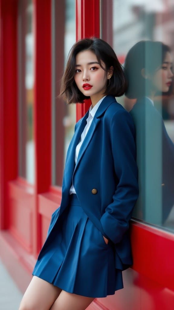 This image showcases a confident young woman in a tailored blue blazer, leaning against a vibrant red wall in a natural outdoor setting. With a soft yet powerful expression, she exudes modern poise and elegance in a photorealistic fashion editorial style.