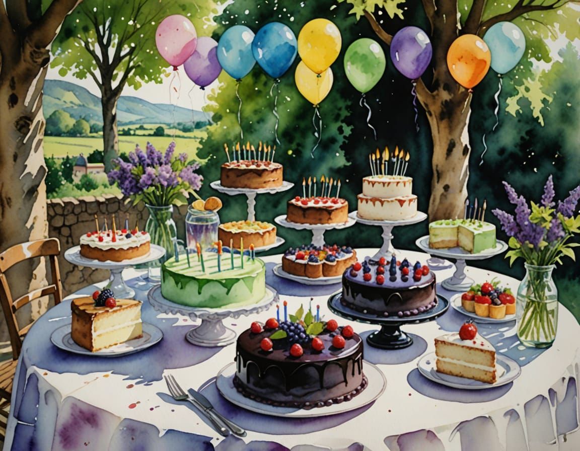 This image showcases a vibrant watercolor painting of a birthday party table set in a charming country scene. Features include a birthday cake and a palette of black, green, white, and purple.