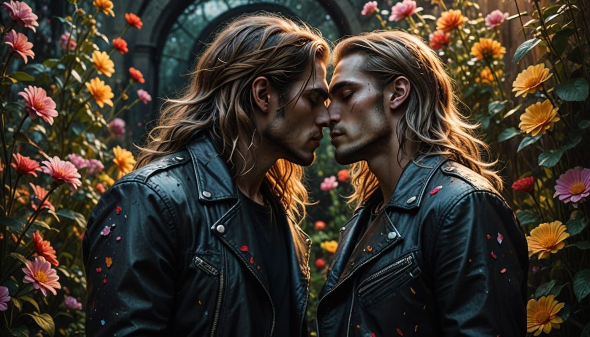 A vibrant image shows two young men with colourful hair sharing a kiss in a hidden flower garden. The piece is rendered as digital art with cinematic lighting and a hyperrealistic aesthetic.