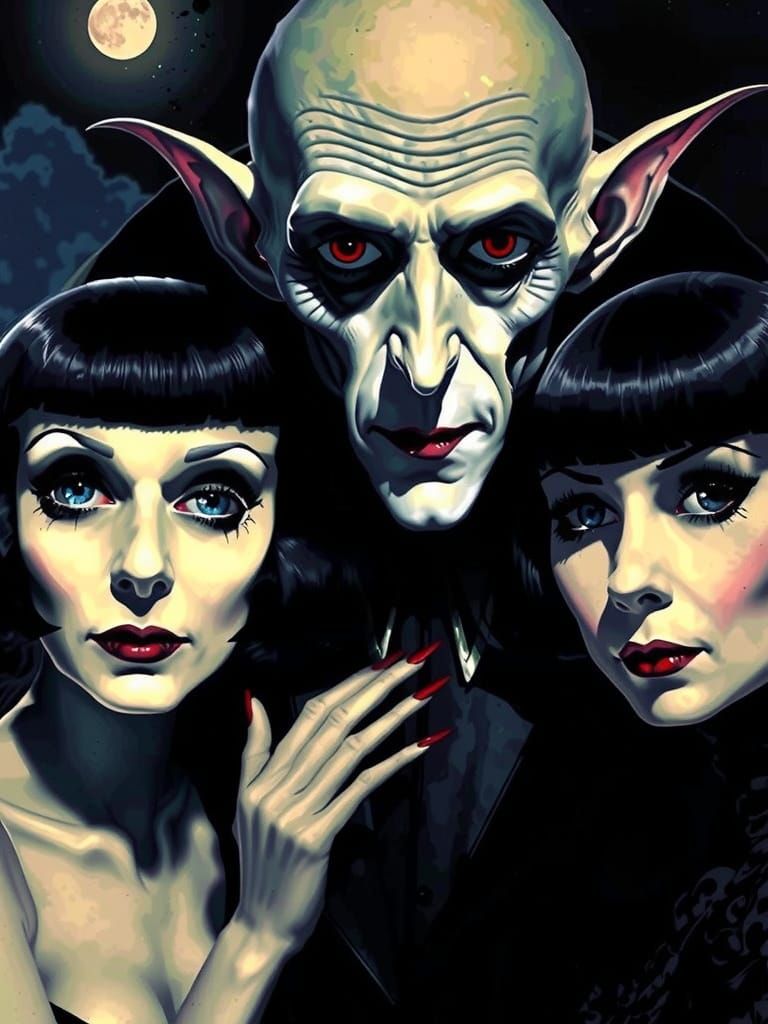 This haunting image depicts Nosferatu's mesmerizing capture of two black-haired females, set against a dark, mystical backdrop of gothic and industrial elements, evoking the eerie atmosphere of a Beksiński-H.R. Giger-Ash Thorp fusion.