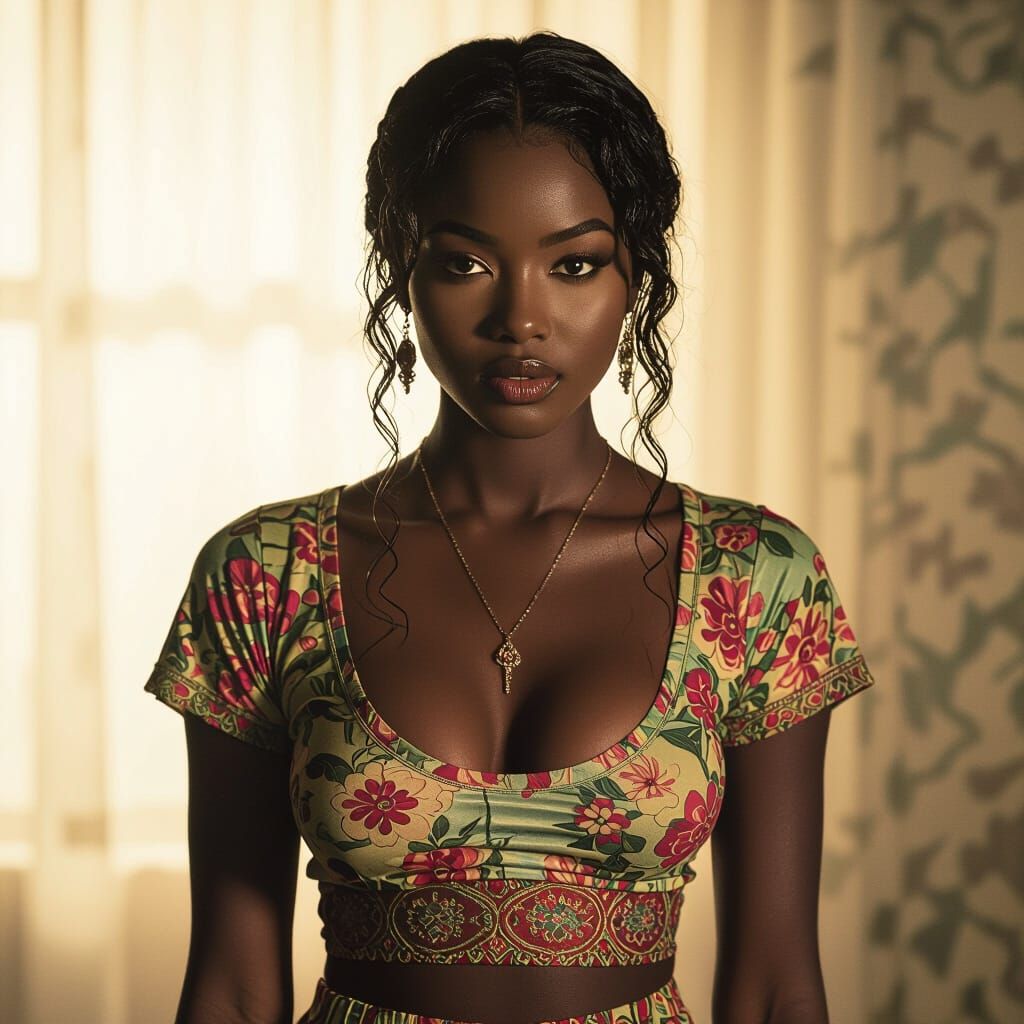 A captivating image of an ebony woman in detailed clothing and a wet t-shirt. The full body pose, cinematic lighting and vibrant colors create an atmospheric, film-like aesthetic.