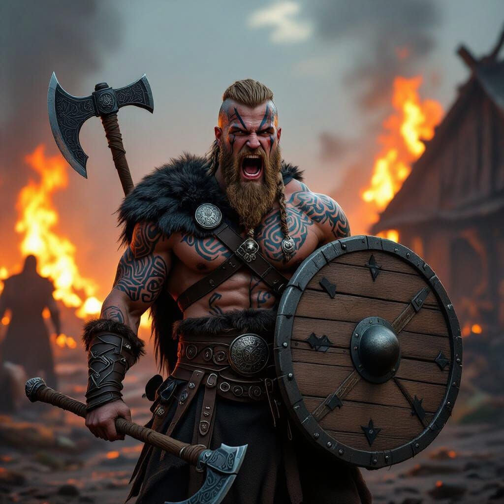 This hyper-realistic image shows a Viking warrior with tattoos, holding an axe and shield, standing before a burning settlement. The dramatic lighting and epic fantasy art style create a powerful, gritty atmosphere.