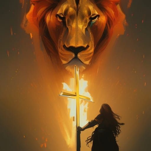 This image shows a girl walking through fire toward a cross, a lion protecting her. The portrait features dynamic lighting, hyperdetailed rendering, and triadic colors, trending on Artstation.