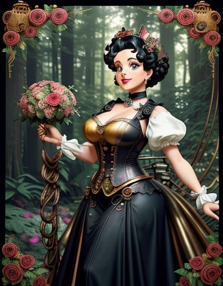 This image features a vibrant, hyper-realistic portrayal of Betty Boop in a steampunk forest, blending Art Nouveau elegance with steampunk details and a dreamy quality, set against a backdrop of soft, golden lighting and pastel colors.