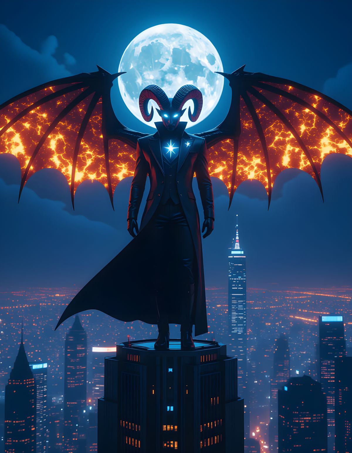 A striking picture of a demonic CEO overlooking a cyberpunk city at night. The character has ram horns, glowing eyes and lava wings, and is depicted in a cinematic, film-like style.