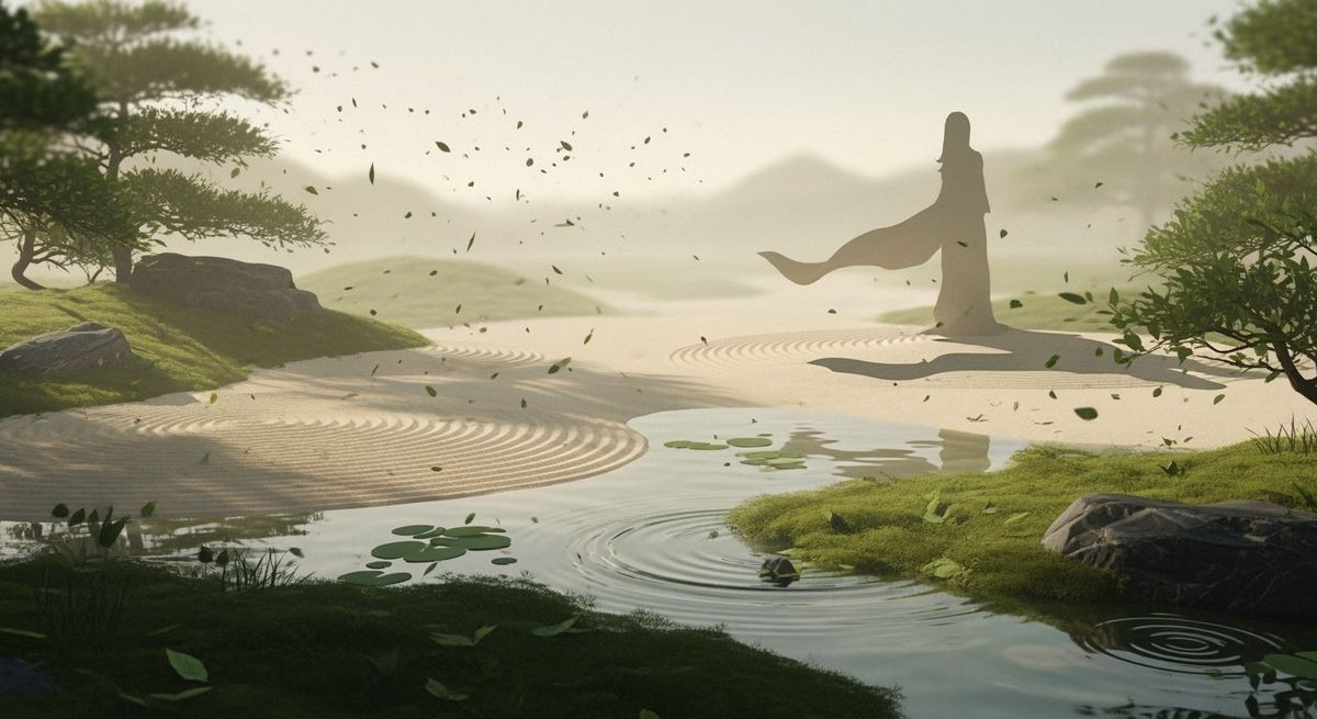This image shows a serene zen garden at dawn, bathed in soft, neutral earth tones. A minimalist figure is subtly present in this tranquil, cinematic digital artwork.