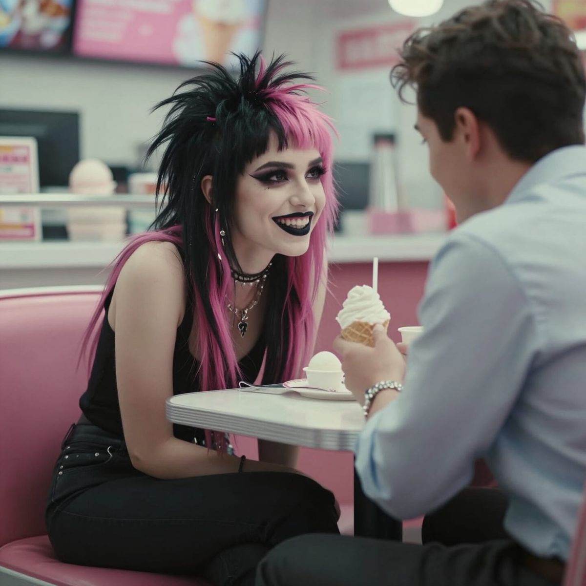 Cinematic film still captures a punk girl with black and pink hair and a conventionally dressed man on a date at an ice cream shop. Atmospheric lighting and film grain enhance the scene.