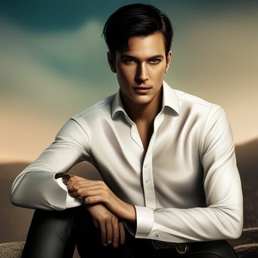 This image shows a tan-skinned man in his 30s with golden eyes, wearing a silk shirt and leather pants. The digital painting features intricate details and complementary colors in a fantasy concept art style.