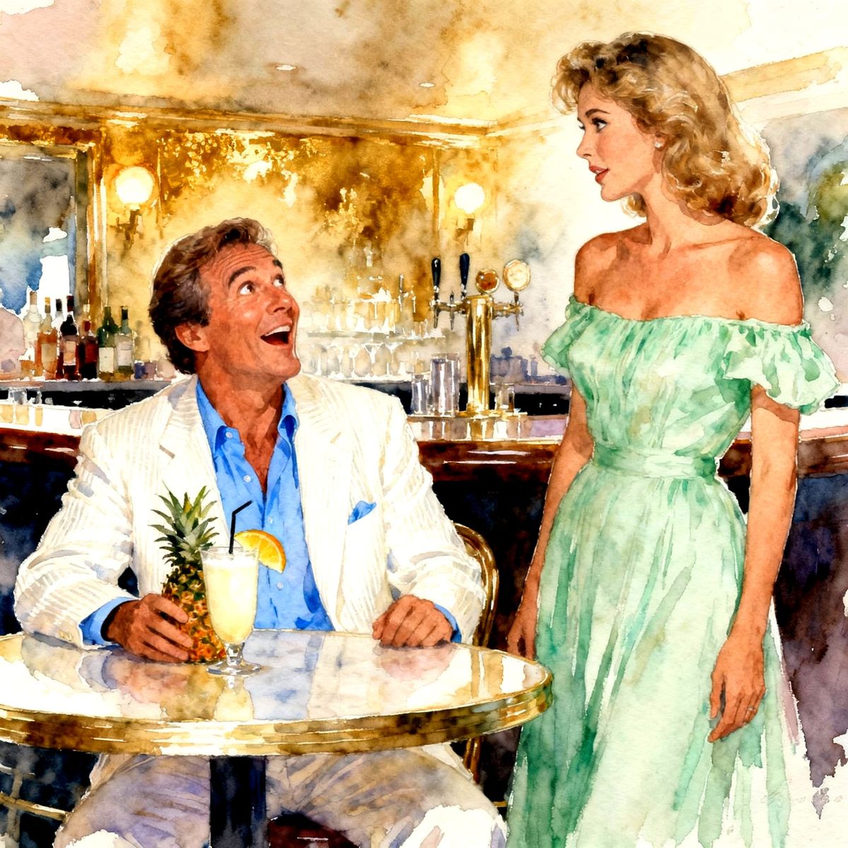 This impressionistic watercolor depicts a surprised man in a linen suit meeting a beautiful woman in a light green dress at a bar in the 1980s.