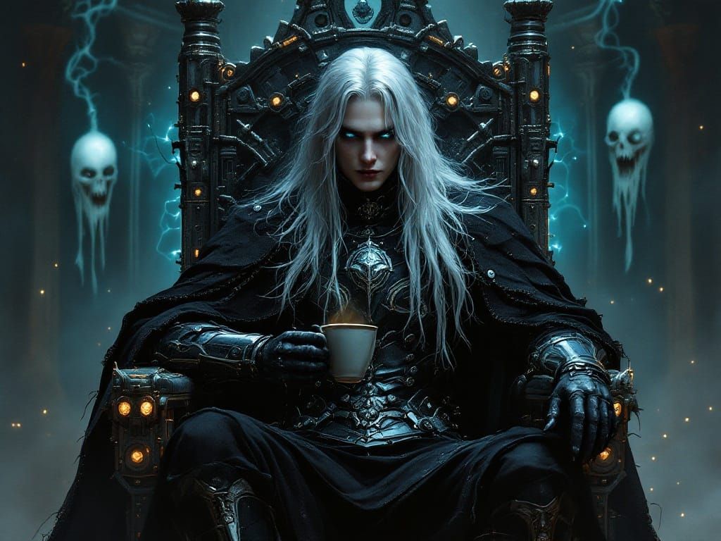 A gothic knight with silver hair and blue eyes sits on a steel throne, holding coffee. The throne room glows with ghostly light. Dark fantasy art with a touch of gothic horror.