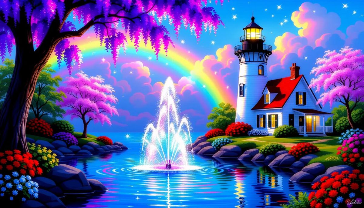 This image showcases a breathtaking garden scene with a sparkling fountain, vibrant jacaranda trees, and a quaint lighthouse. The art style is ultrarealistic with dazzling, opalescent colors.