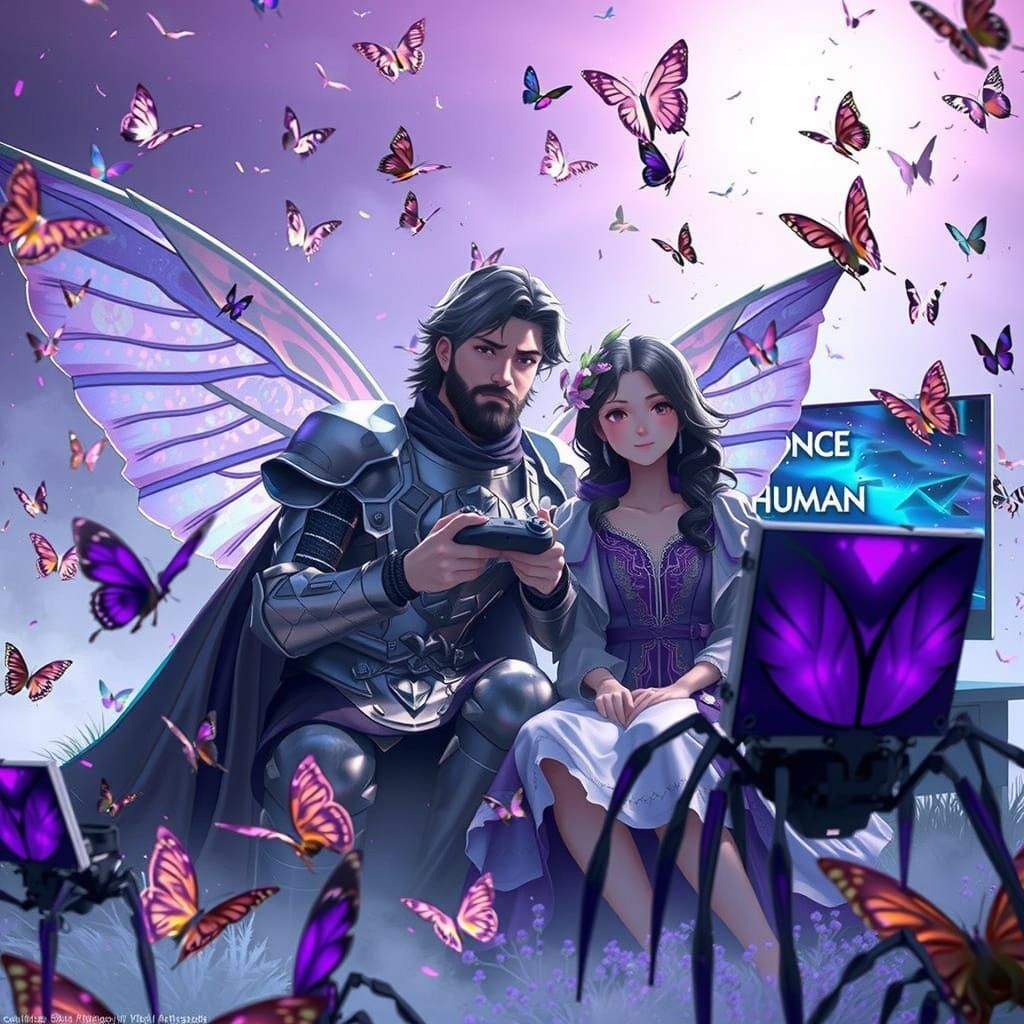 @Hellsingdog1 Kondraki, dark hair and beard, knight outfit with butterfly wings, and Inanna, brunette wavy hair, angel wings, white and purple dress, play Once Human video game together, holding gaming controllers, surrounded by green and black butterflies and purple spiders, in the Light Realm, with a TV displaying the game, in a cinematic, 8K resolution, 3D anime art style, inspired by WLOP and Artstation, with intricate details, dynamic lighting, and a breathtaking atmosphere, reminiscent of works by Ash Thorp, Simon Stalenhag, and Noah Bradley.