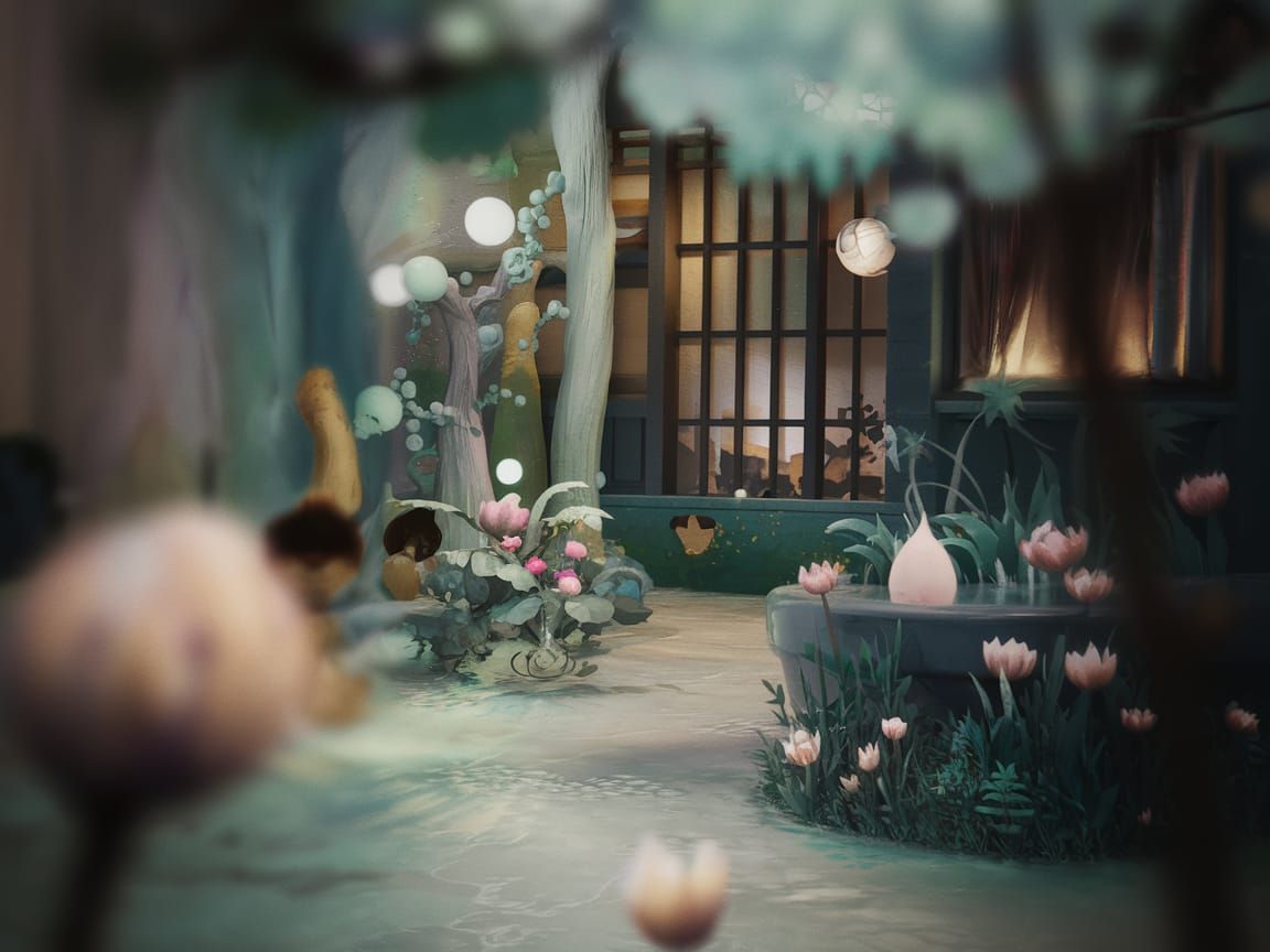 This image features a medium shot with a shallow depth of field, creating a dreamy, whimsical atmosphere. Muted colors and soft contrast evoke introspection and calm, reminiscent of animated film aesthetics.