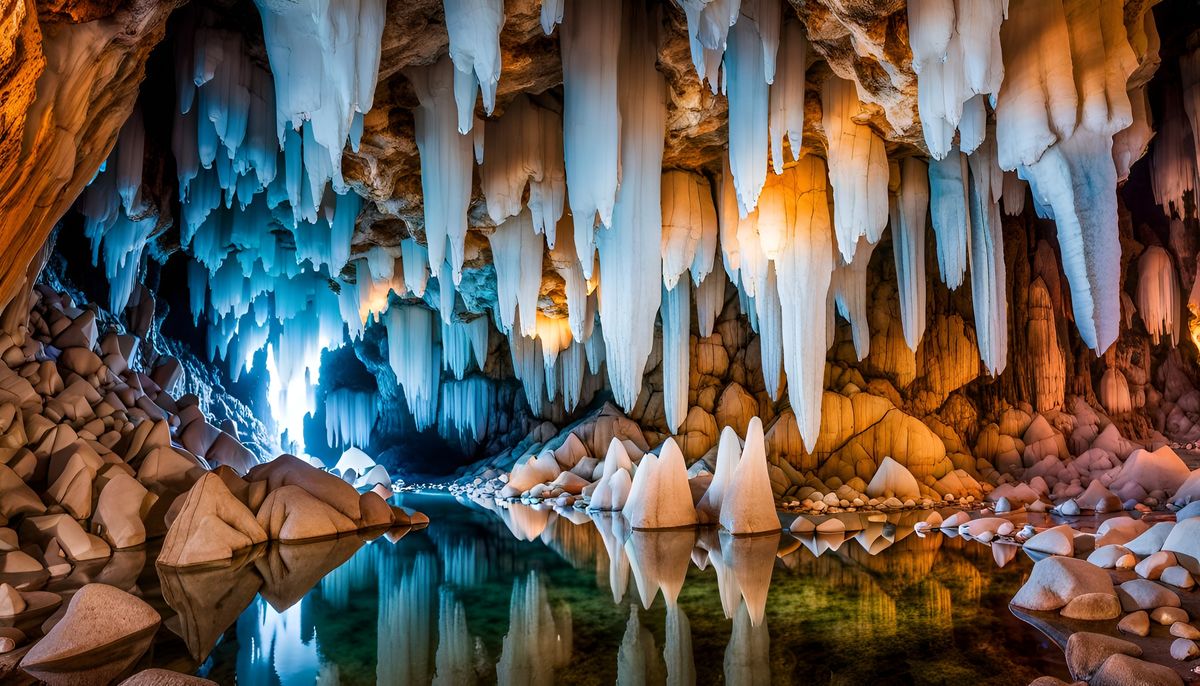 This image shows the Crystal Cave in Sequoia National Park, California, featuring a subterranean river. Selenite crystals shimmer in the light, creating a magical, otherworldly atmosphere.