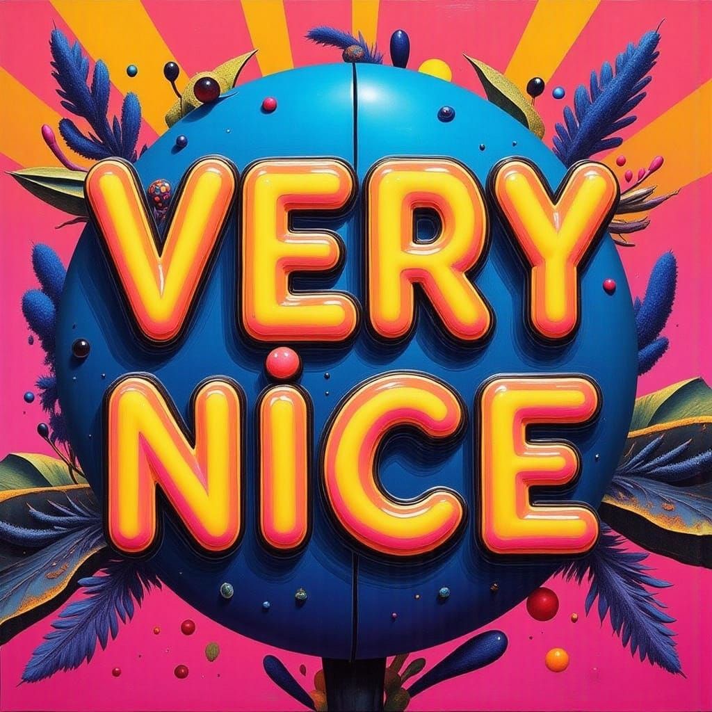 This image features a bold, futuristic banner with a metallic sheen, displaying "VERY NICE" in vibrant neon colors. Inspired by 80s graphic pop art with clean lines and geometric shapes.