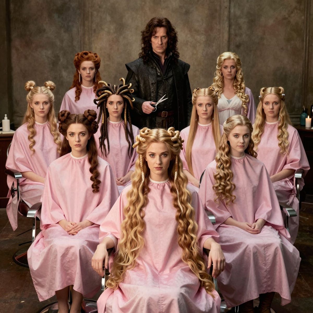 This image depicts seven powerful goddesses with incredibly long hair seated in salon chairs, attended by Aragorn preparing for a dramatic hairstyling transformation.